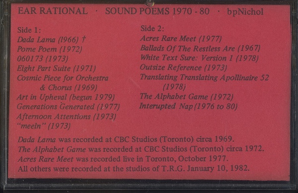 Notes: The text for this piece was written in 1978. The recording was made in Toronto on 10 January 1982.