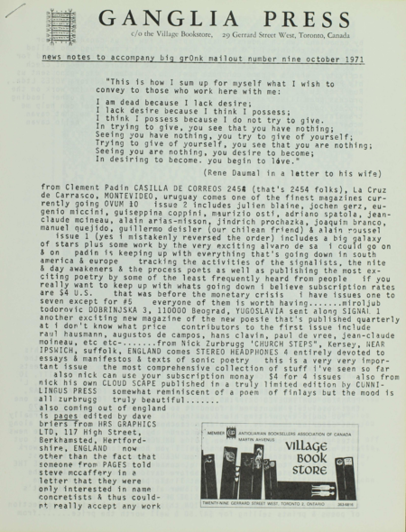 i) news notes to accompany big grOnk mailout number nine october 1971 (prose, front cover & throughout; epigraph by Rene Daumal)