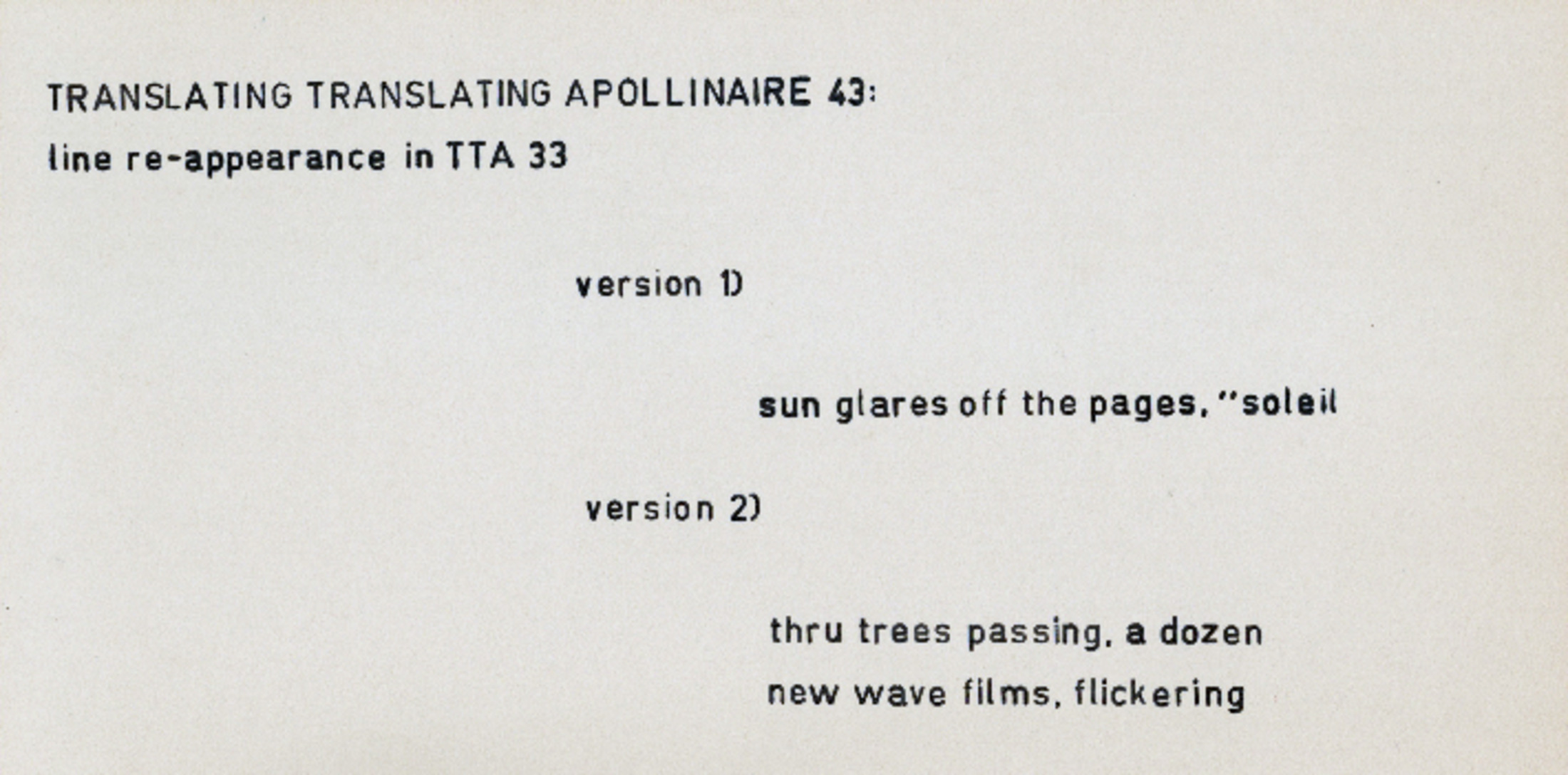 Genre Ephemera Tags Homolinguistic Translation CURVD H&Z Collection bpNichol Digital Collection Contributors Author: bpNichol Date Issued 1983 Local Identifier bp0072 Work Type Literary Work Title without prefix Translating Translating Apollinaire 43 Publisher Curvd H&Z License Estate of bpNichol License Legacy ID 150 Artmob Citation ID 148