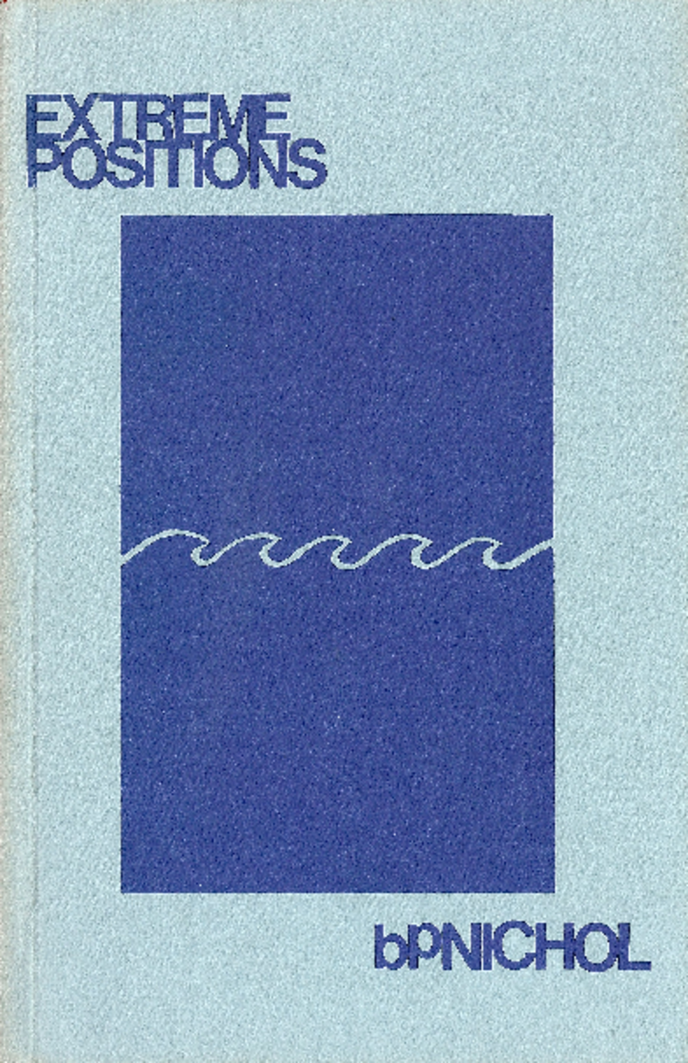 bpNichol, Extreme Positions. Edmonton: The Longspoon Press, 1981.  Back cover: Extreme Positions, bpNichol's fourth published novel, uses the techniques of visual poetry to tell the extended tale of a ménage à trois. In a series of quick word stills the stilted violence unwinds as seen from the viewpoint of a terrified, distant, almost peripheral narrator/witness.