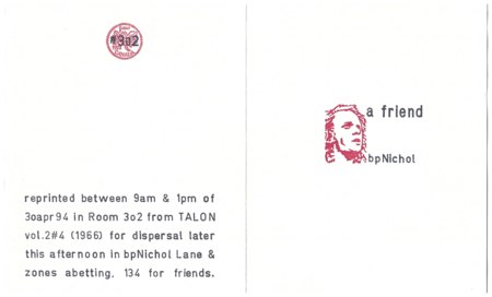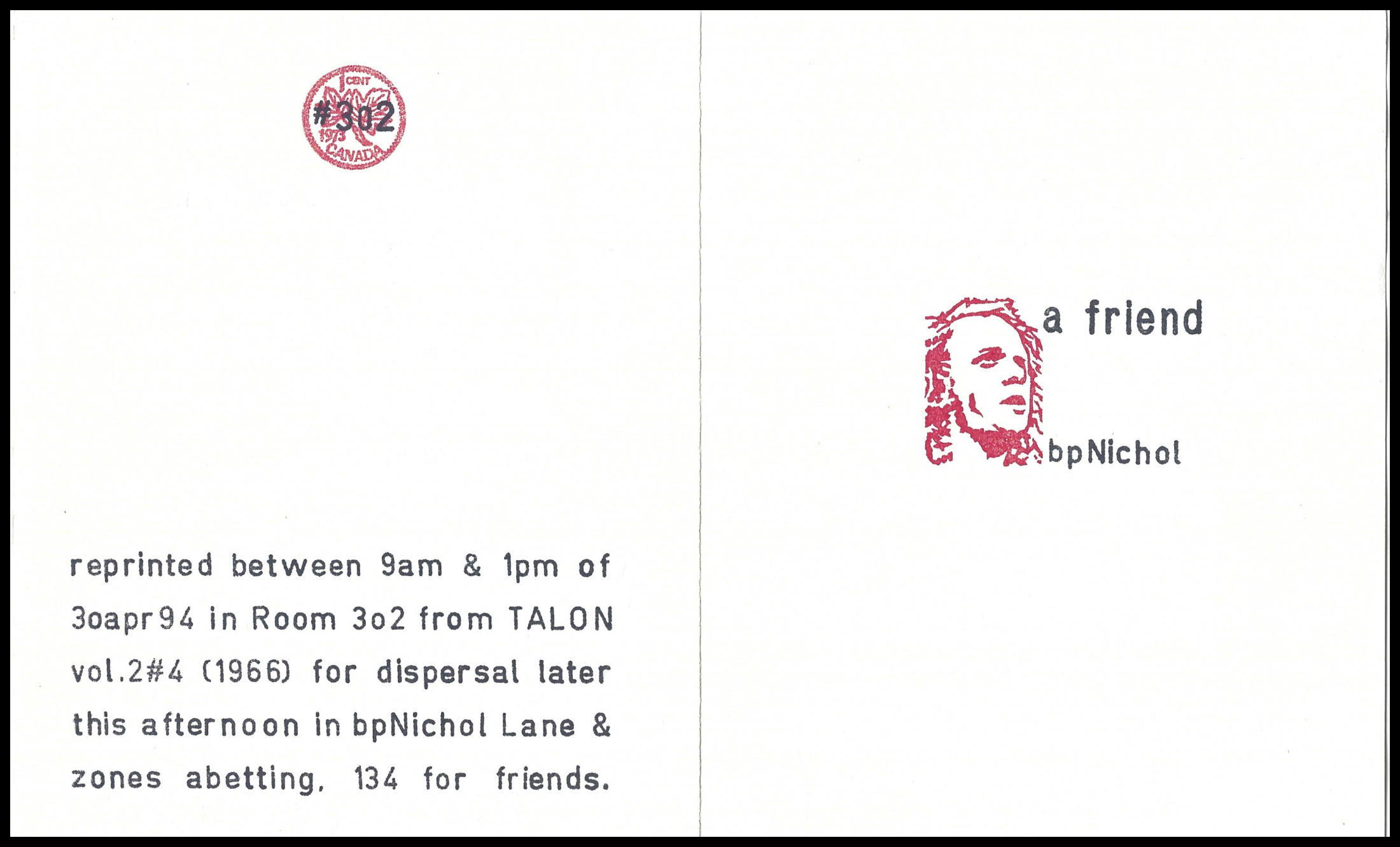 A Friend. Postcard. Toronto: 1cent #302 (1994). Colophon: reprinted between 9am and 1pm of 30apr94 in Room 3o2 from TALO Vol. 2#4 (1966) for disperal later this afternoon in bpNichol Lane & zones abetting. 134 for friends.