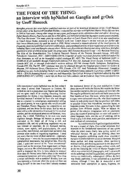 Genre Interview Tags Ganglia grOnk Interview Rampike Collection bpNichol Digital Collection Contributors Author: Geoff Hancock Author: bpNichol Date Issued 2002 Local Identifier bp0128 Work Type Literary Work Title without prefix Form of the Thing: an Interview with bpNichol on Ganglia and Gronk. Publisher Rampike License Estate of bpNichol License Legacy ID 215 Artmob Citation ID 264