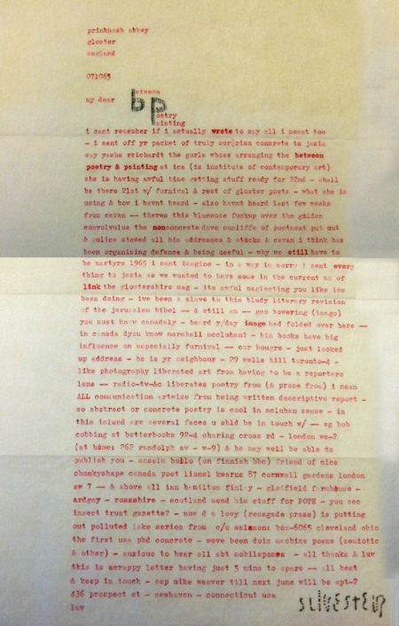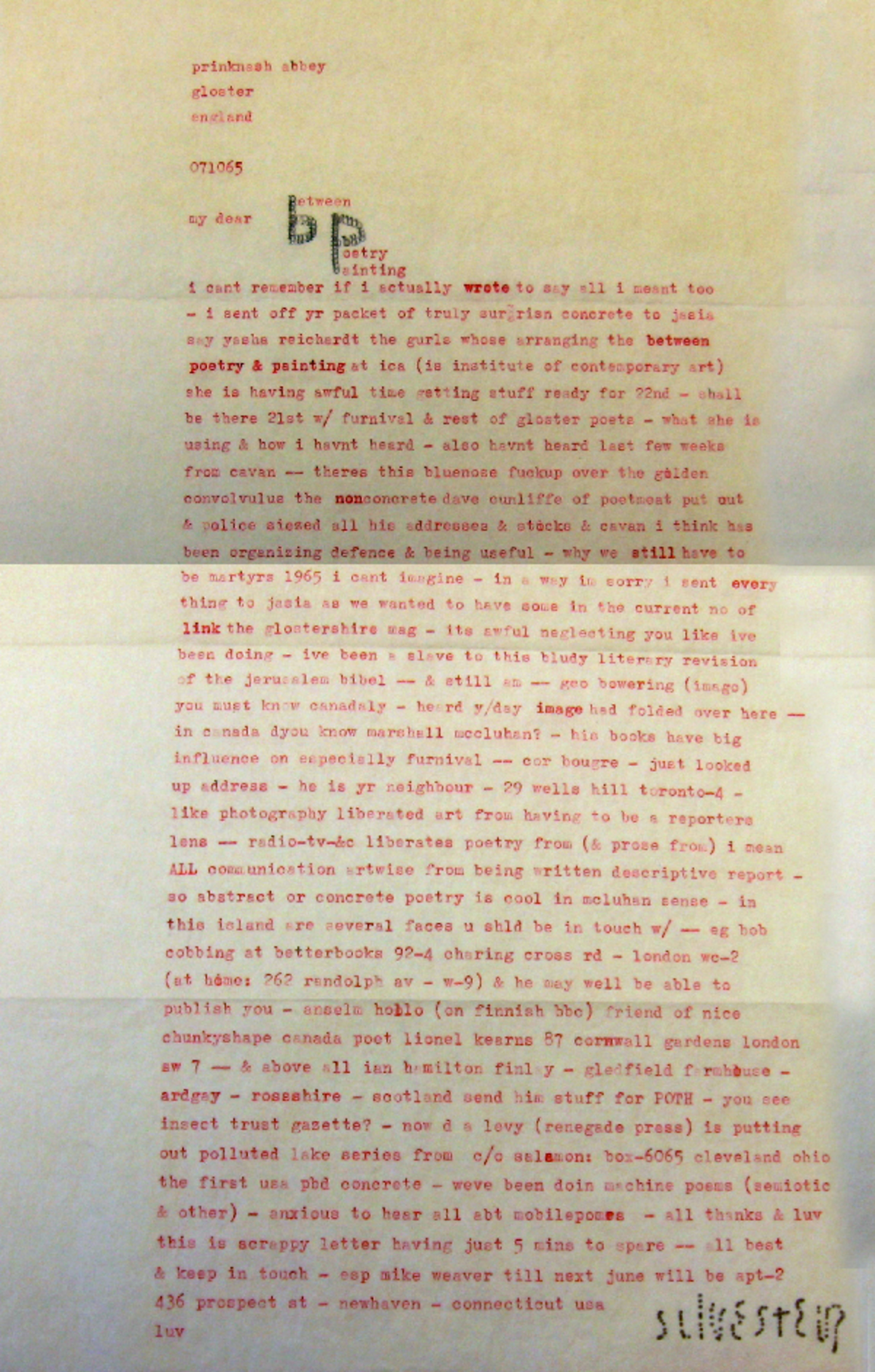 Genre Ephemera Tags Letter concrete poetry Collection bpNichol Digital Collection Date Issued 1965 Local Identifier bp0150 Work Type Literary Work Title without prefix "Between Poetry/Painting" License Estate of bpNichol License Legacy ID 241 Artmob Citation ID 308