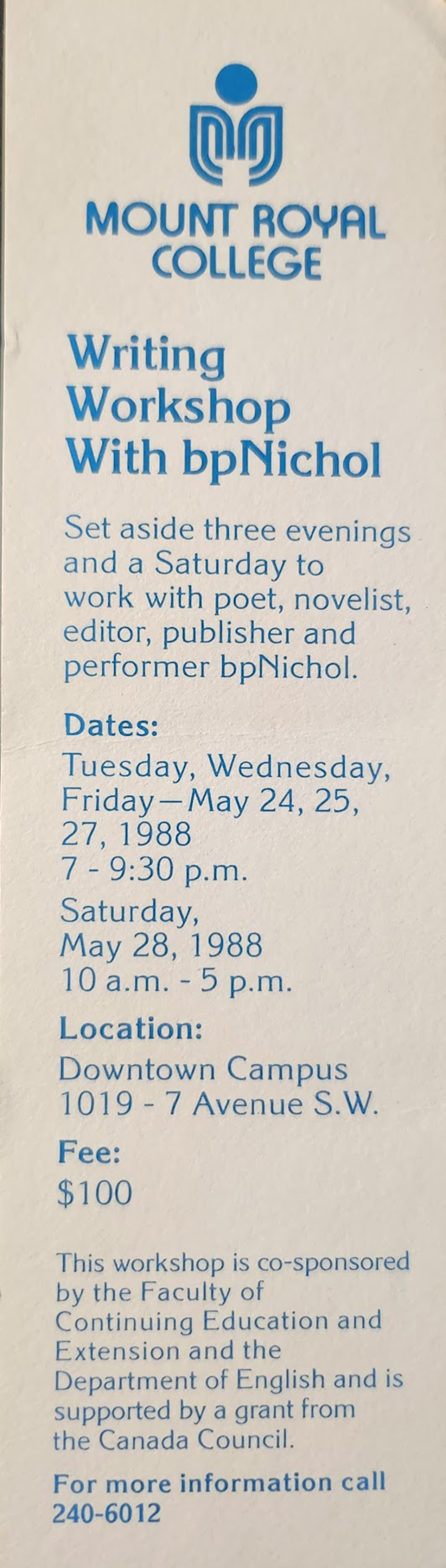 Writing Workshop with bpNichol. Bookmark. 24, 25, 27 May 7:00pm - 9:30pm, Saturday 28 May 1988 10:00am - 5:00pm. $100.